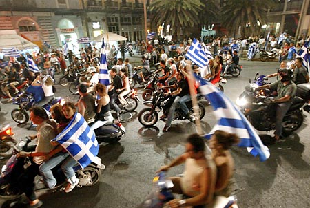 Οι Έλληνες, μουδιασμένοι από το φόβο της καταστροφής, που πλέον μοιάζει αναπόφευκτη, παίρνουν θέση μπροστά στην τηλεόραση - έτσι κι αλλιώς τα σαββατόβραδα δεν βγαίνουν και πολλοί πια στη γύρα. Κι ενώ, λίγο η περιρρέουσα ηττοπάθεια, λίγο η προηγηθείσα ήττα από την Τσεχία, μας είχε προετοιμάσει για αποκλεισμό, ο bigger than life Καραγκούνης το έκανε πάλι το θαύμα του: με ένα σουτ στο 46’ έστειλε την μπάλα στα δίχτυα και την ψυχολογία μας στο κόκκινο.