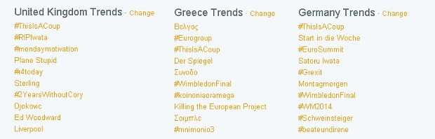 Και ενώ βρισκόταν σε εξέλιξη το θρίλερ της διαπραγμάτευσης στις Βρυξέλλες για το ελληνικό ζήτημα κάποια στιγμή έφθασε να είναι πρώτο hashtag στο Twitter #ΤhisisACoup (Αυτό είναι πραξικόπημα).