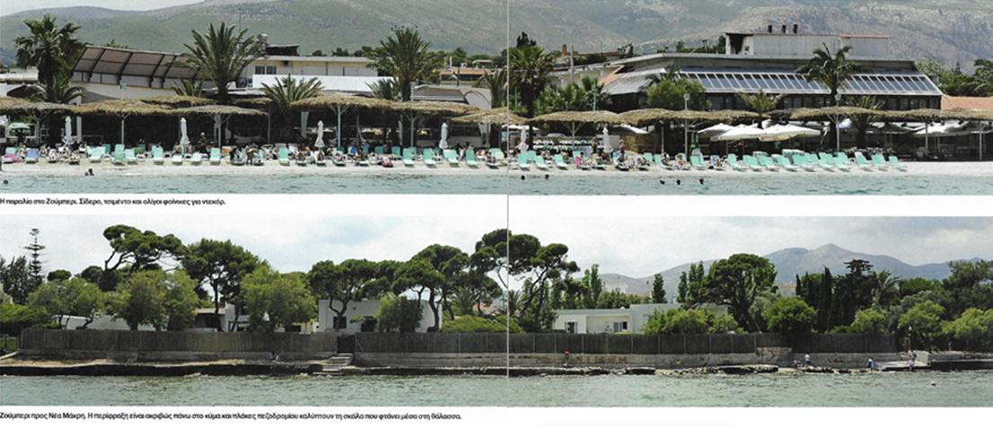 Προσπεράσαμε εμπόδια, σκοντάψαμε στις περιφράξεις επιχειρήσεων και κατοικιών, είδαμε οικοδομές επί το έργον να απέχουν μια ανάσα από το νερό. Ενιαίο θαλάσσιο μέτωπο αναζητήσαμε. Τι βρήκαμε; Κατατμημένη γη, κακογουστιά, τσιμέντο και άναρχο οικιστικό σχεδιασμό κρυμμένα πίσω από δαιδαλώδεις νομοθεσίες και πλήθος «συναρμόδιων» υπηρεσιών. Αφετηρία μας το Μάτι και προορισμός μας ο Σχινιάς, με ενδιάμεσους σταθμούς της διαδρομής -που κάναμε με αυτοκίνητο, με τα πόδια και με φουσκωτό- το Ζούμπερι, ο Άγιος Ανδρέας, η Νέα Μάκρη, ο Μαραθώνας. Πρώτο συμπέρασμα; Αν κάποιοι μπορούσαν να χτίσουν και μέσα στη θάλασσα ακόμη, θα το είχαν πράξει. Στην παραλιακή ζώνη της ανατολικής Αττικής, οι ταβέρνες, οι αυθαίρετες καντίνες, τα beach bars, οι ομπρελοξαπλώστρες, τα σπίτια και τα κάγκελα εναλλάσσονται σε ποικίλους συνδυασμούς πάνω στο κύμα. Στο μεταξύ, το άρθρο 24 του συντάγματος ορίζει πως «η προστασία του φυσικού και πολιτιστικού περιβάλλοντος αποτελεί υποχρέωση του κράτους και δικαίωμα του καθενός». Και επειδή οι ακτές συνιστούν βασικό στοιχείο του φυσικού περιβάλλοντος, η Πολιτεία οφείλει να διασφαλίζει την ελεύθερη πρόσβαση και τον κοινόχρηστο χαρακτήρα τους. Όμως, στην πράξη αποδεικνύεται πως ορισμένοι έχουν περισσότερα... δικαιώματα από τους υπολοίπους: ρίχνουν μπετόν, στρώνουν με πλάκες πεζοδρομίου την αμμουδιά (!) μπροστά στο σπίτι ή στο μαγαζί τους.